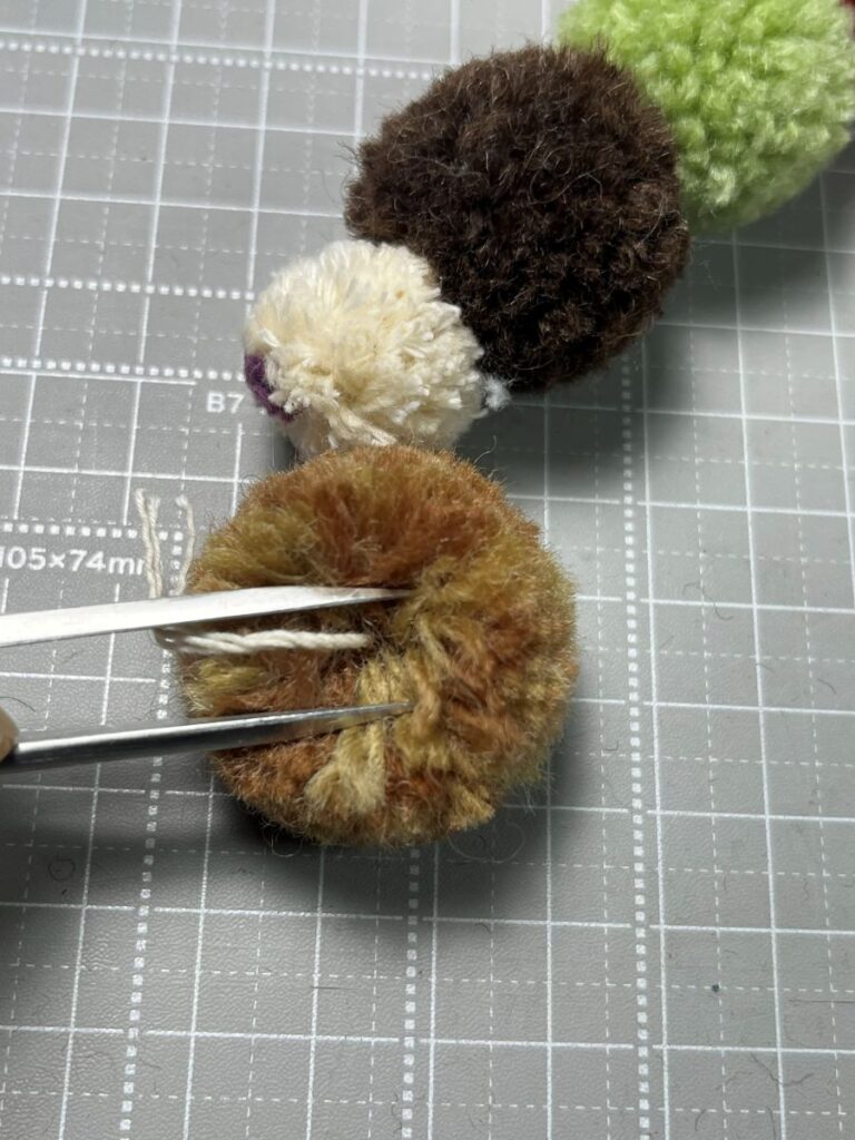 ① ぽんぽんの結び目に干渉しない中心位置に糸を通す