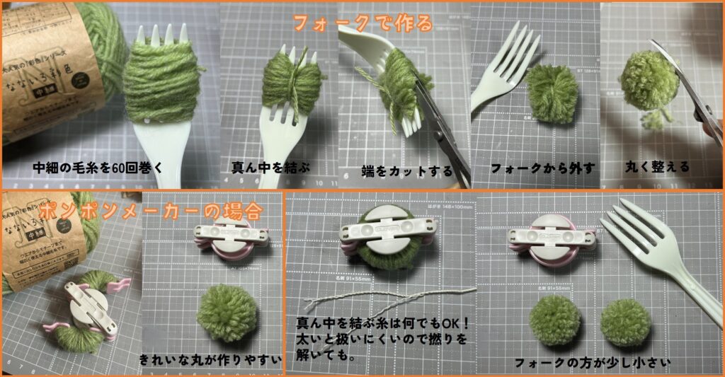 ぽんぽんは、市販のポンポンメーカーを使うときれいな丸い形に仕上がりやすいですが、